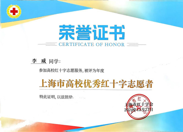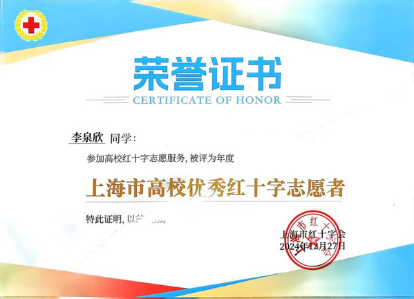 近日,2024年上海市高校红十字志愿服务总结展示暨骨干能力建设会议召开。经前期考核申报,上海市红十字会基层组织和青少年部审核,学院2名学生获评2024年度上海市高校优秀红十字志愿者。