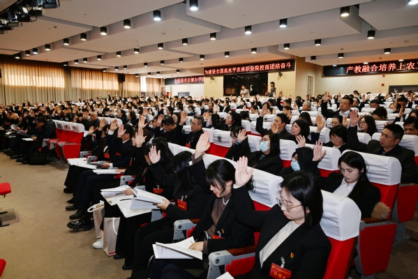 报告号召,在新的历史发展机遇面前,全校各级党组织、全体党员和广大师生员工以习近平新时代中国特色社会主义思想为指导,贯彻党的二十大、二十届二中、三中全会精神,和全国教育大会精神,用舍我其谁、责无旁贷的胆量气魄,勠力同心、埋头苦干、全力以赴、攻坚克难,自信自强、守正创新,踔厉奋发、勇毅前行,为把学校建成全国高水平农林职业院校而团结奋斗!
