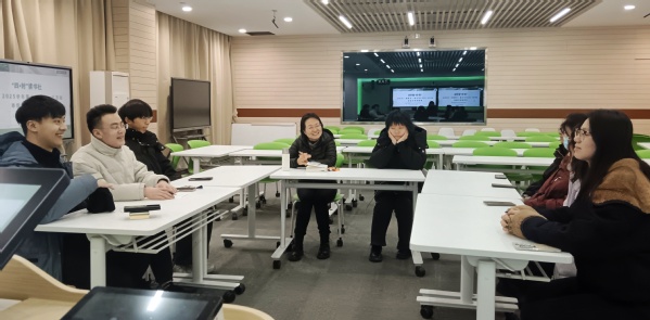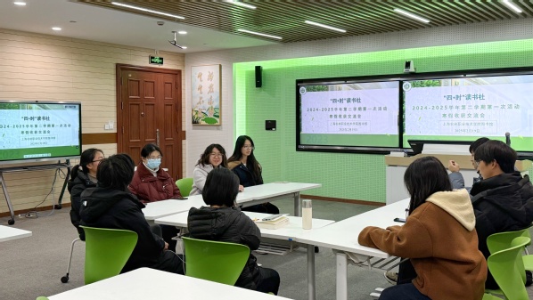 “四· 时”读书社的社员们在寒假中有何收获?2月19日下午,在综合楼403智慧教室,图书馆馆长、读书社指导老师樊清誉与社员们围桌而坐,共同交流分享寒假收获。