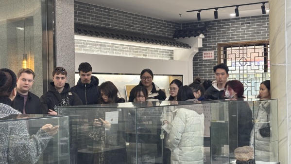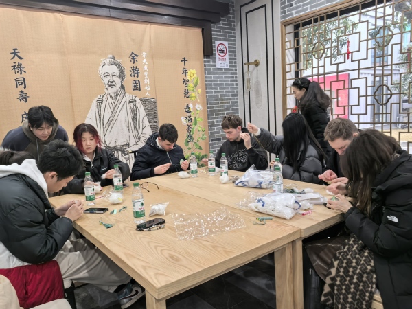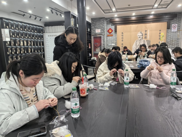 2月25日,即将赴法交流学习的“法国亚眠高等商学院数字经济管理类专业学分互认课程班”的同学们,与来自法国亚眠高等商学院的同学们齐聚余天成上海云间粮仓文创园店,共同参与了一场别开生面的中医药文化体验活动。活动以“八段锦养生功法”和“手工香囊制作”为主题,旨在通过沉浸式互动,增进中法师生对中国传统文化的理解与交流。
