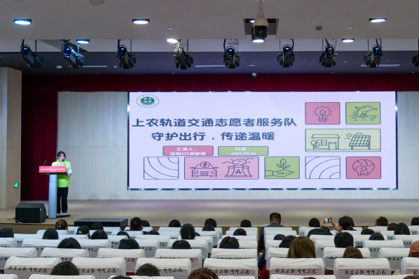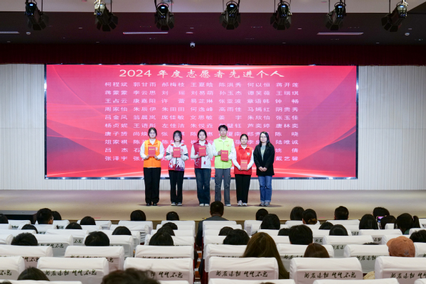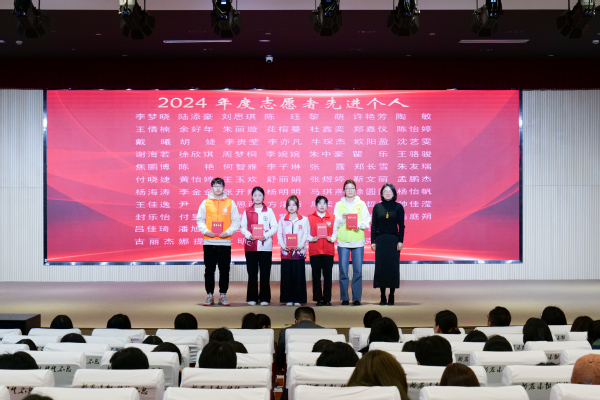 学工部副部长张莎莎宣读表彰决定。授予陈晓等40人2024年度志愿者“标兵”称号,授予柯程斌等141人2024年度志愿者“先进个人”称号,授予朱中豪等15人第七届中国国际进口博览会“优秀志愿者”称号,授予上农轨道交通志愿者服务队等6个志愿服务团队2024 年度“志愿服务先进集体”称号,授予阳光之家志愿服务项目等5个志愿服务项目2024年度“优秀志愿服务项目”称号,授予崔鹏展等7人2024年度“志愿服务优秀指导教师”称号。各系学生工作负责人为获奖师生颁奖。