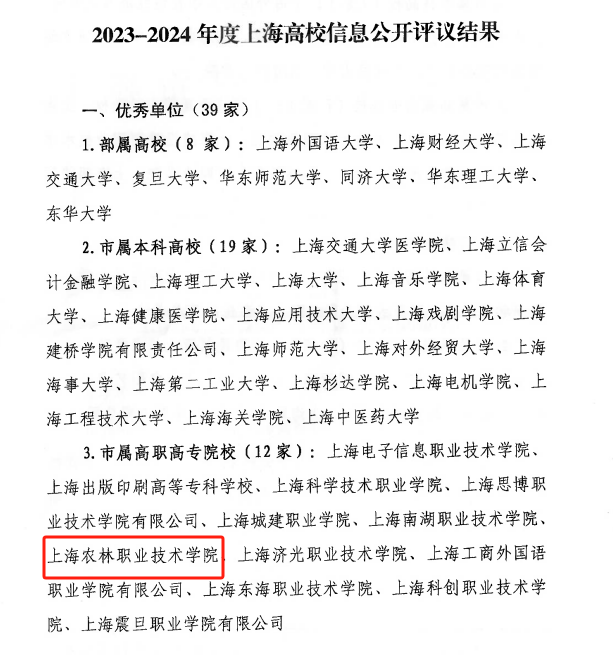 近日,上海市教育委员会公布了2023-2024年度上海高校信息公开评议结果(沪教委办〔2025〕8号),学院获评2023-2024年度上海高校信息公开评议“优秀单位”。