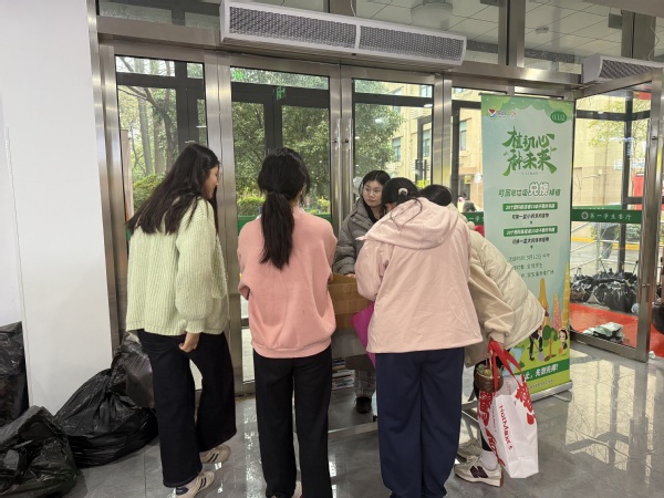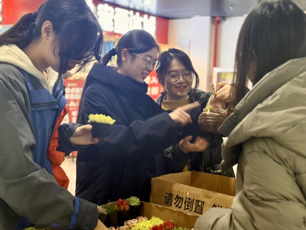 活动现场,工作人员早早在食堂一楼精心布置好摊位,摆放着一盆盆生机盎然的多肉植物,按照规则,学生们只需收集20个空瓶子,就能兑换一盆小巧精致的小多肉;若能集齐30个空瓶,便可将一盆更为繁茂的大多肉带回家悉心照料。 摊位刚一设立,便瞬间成为学生们关注的焦点。大批学生手持积攒的空瓶,满怀期待地排起长队,迫不及待地想要参与这场特殊的“交易”。仅仅五分钟,所有大盆的多肉植物便在学生们的踊跃兑换中一抢而空。虽大多肉“售罄”,但学生们的热情丝毫未减,小盆多肉的兑换区依旧热闹非凡,大家有序地完成兑换,脸上洋溢着满足的笑容。