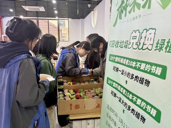 3月12日是我国第47个植树节,也是全民义务植树运动开展的第44周年。当天中午,学工部在食堂一楼开展“‘植’此青绿,拥抱春天”可回收垃圾兑换多肉植物活动,吸引了众多学生热情参与,为校园增添了一抹盎然绿意与环保活力。
