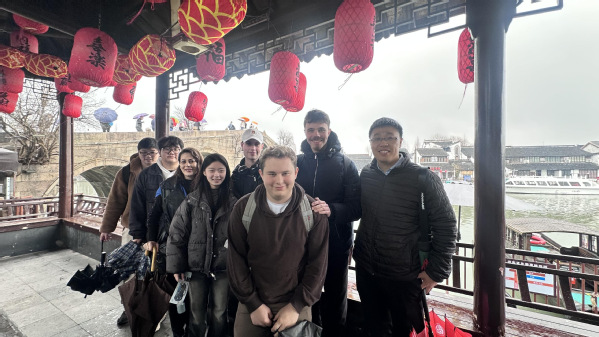为了让法国学生进一步了解中国江南水乡文化,李明老师带他们游览上海朱家角古镇。这座古镇的白墙灰瓦、青石板路、雕花门窗、蜿蜒水道将江南传统建筑的精妙工艺体现的淋漓尽致,他们走进朱家角古镇感受江南水乡的居民的生活方式和经商智慧。法国学生感受着古镇的水乡风情与现代都市的繁华交相辉映,内心被古镇的历史厚重感和自然生态所震撼,仿佛能感受到千年前的繁华与如今的宁静共存。