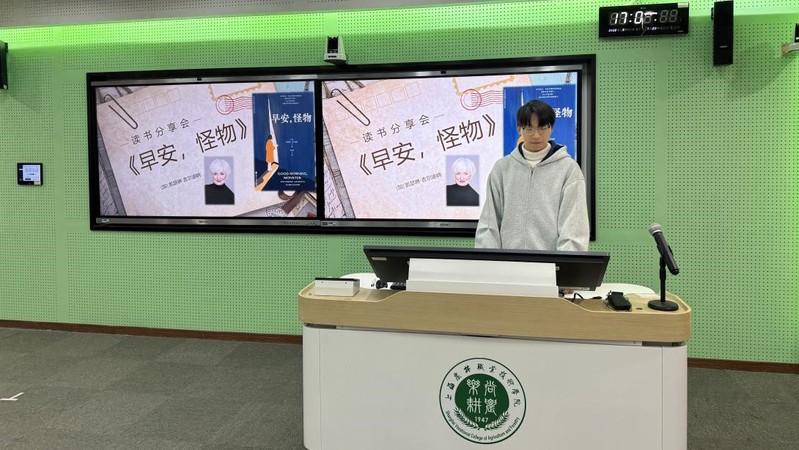 3月19日下午,在综合楼403智慧教室,“四·时”读书社开展本学期第四次读书分享活动。由创意系王一喊同学以创新的沉浸式分享方式带领社员们共同体验[加]凯瑟琳·吉尔迪纳著作《早安,怪物》。指导老师、图书馆馆长樊清誉主持分享会。