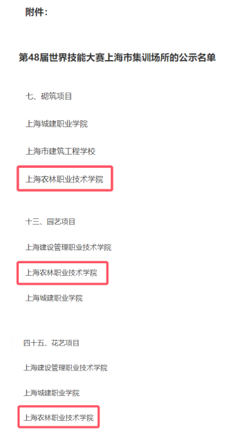 近日,上海市人力资源和社会保障局公示了第48届世界技能大赛上海市集训场所名单,确定在62家单位设立169个第48届世界技能大赛上海市集训场所。我院的花艺项目、园艺项目、砌筑项目上海市集训基地申请获批。