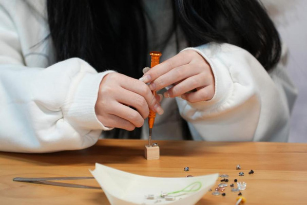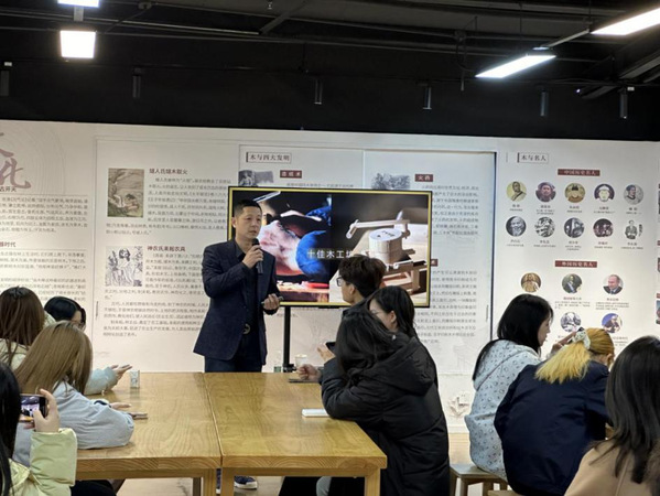 随后,EKA·天物负责人肖总带大家参观了FOR天物空间二期,这里有24小时城市不眠书店,书店占地 600 平方米,是一座高达 6 米的大型玻璃房建筑,四面墙体采用落地窗玻璃,内部安装大面积暖黄色原木书架,打造出舒适、温馨的品质阅读空间。肖总还介绍天物空间旗下重磅打造的文化集合IP“初见集”,它是探索以“文化、艺术、生活与创意”为核心的沉浸式文化盛宴,涵盖茶会、市集、展览等等。接着,同学们来到十佳木工坊,了解中国传统木文化历史和木工非遗技艺,并在肖总的详细讲解和亲自示范指导下,大家参与木工制作,从刨削到拼接,亲身感受匠人精神与手工艺的温度。