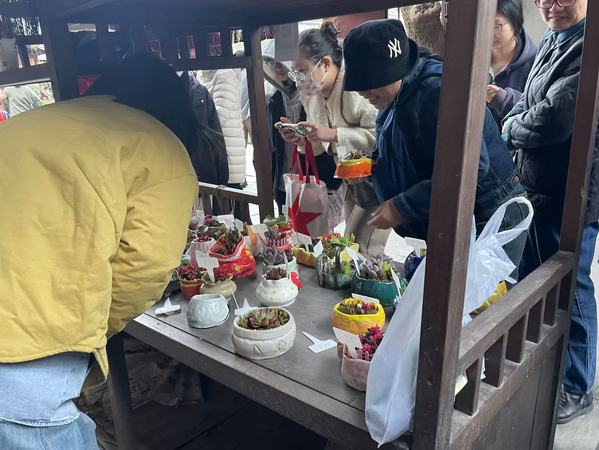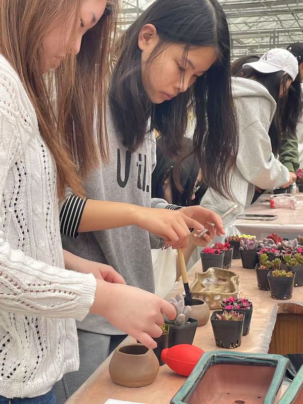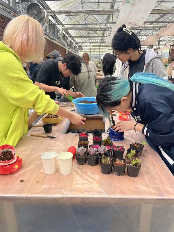 为了在活动中呈现出好的学生陶瓷作品,整个三月创意系教师不断教学生将在《文创产品创意设计》课程中学习的文创产品设计理念和方法应用于《陶艺文化作品制作》的设计图纸中,学生根据作品的设计图纸,开始着手陶泥的选择、成型、上釉,老师悉心指导学生创作的每一个环节,赋予每个作品独特的意义。此外,为了在活动中为市民呈现更加完整的作品,实训基地大力支持创意系师生开展多肉盆景制作活动,同学们将自己制作的陶瓷花盆和各种多肉植物相结合,亲手完成从选种、培土到栽种的全过程。每个步骤都亲力亲为,在实践中学习到了植物生长特性、土壤配比等专业知识。最终,精美的陶瓷多肉盆栽在活动中展示和售卖,为两场活动吸引了大量的市民驻足,成为活动现场一道亮丽的风景线。