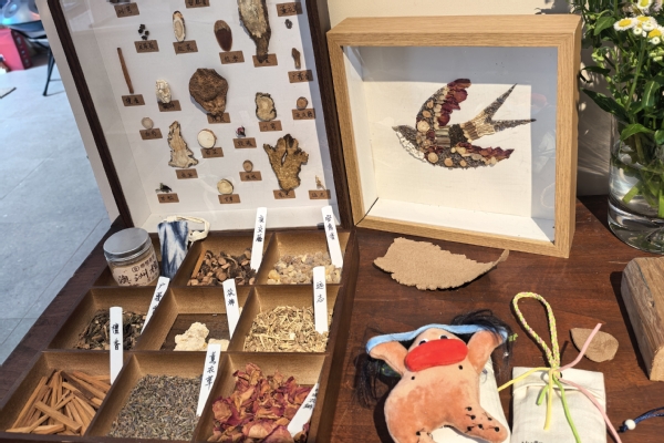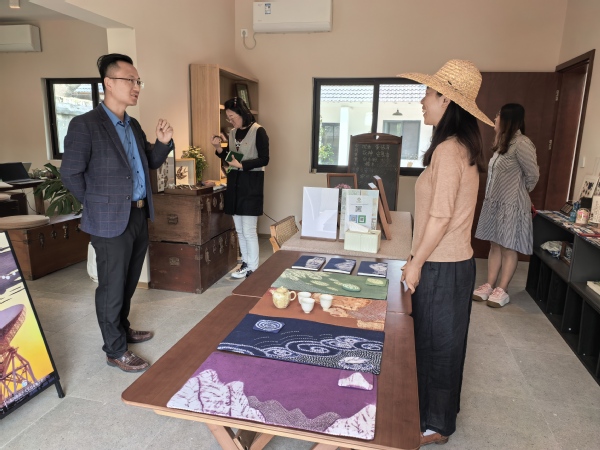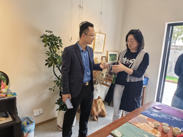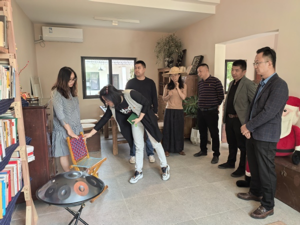 一行人来到346号馆,该馆定位是艺术休闲体验功能,主理人为大家介绍了该馆的运营模式、目前现状和未来规划,对馆内陈列布局、空间展示、手工艺品等开展交流,交流过程中张许杰发现余天成的科普讲座和中草药文创手工艺品可以和346号馆进行合作,张媛发现文创专业学生可以将创意赋能中医药香薰、手串等文创品,三方围绕着天马星空村“IP”创造文创商品展开探讨并发现合作切入点,既为村里增添了新的文创项目又为余天成形成了品牌推广效应,同时增加了学生的实践能力和创造力。