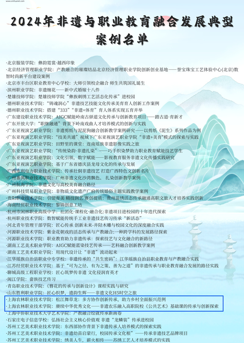 近日,新华网“2024年非遗与职业教育融合发展典型案例”评选结果揭晓,基础部报送的《赓续中华优秀文化——非遗农乐融入高职院校公共艺术基础课的传承与创新探索》《松江舞草龙:多方协作创新传承,助力乡村全面振兴范例》从全国200余个申报案例中脱颖而出,成功入选。这一荣誉标志着学院在推动非物质文化遗产传承与职业教育深度融合领域的创新实践获得国家级平台认可,为职业教育赋能传统文化传承提供了示范样本。