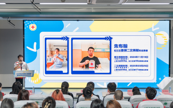 松江区首例二次捐献志愿者、松江区应急管理局应急科科长朱布翰向同学们宣讲。他曾在4个月内两次捐干细胞,登上微博同城热搜,被网友纷纷赞誉,称“人间有大爱”。他结合自身两次捐献干细胞的经历,用朴实简单的语言,让同学们真切感受到他捐献过程中的坚定与“人道、博爱、奉献”的红十字精神。朱布翰坦言:“捐献过程远比想象中轻松,而想到自己的善举能够挽救一个人的生命,甚至拯救一个家庭,内心便充满了自豪与欣慰。”