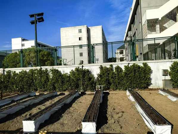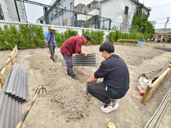 老师们针对学校场地条件与要求,提出在场地内安装便于栽培的栽培槽,采用无土栽培的方式进行种植,同时使用滴灌的灌溉方式,在节水的同时,还能实现水肥一体化。在实地考察场地后,老师们更换了原本植物栽培槽的设计构想,采用石棉瓦等材料,依托场地土地条件,打造了更“接地气”的栽培槽,在安装完毕之后还进行了番茄苗的定植。