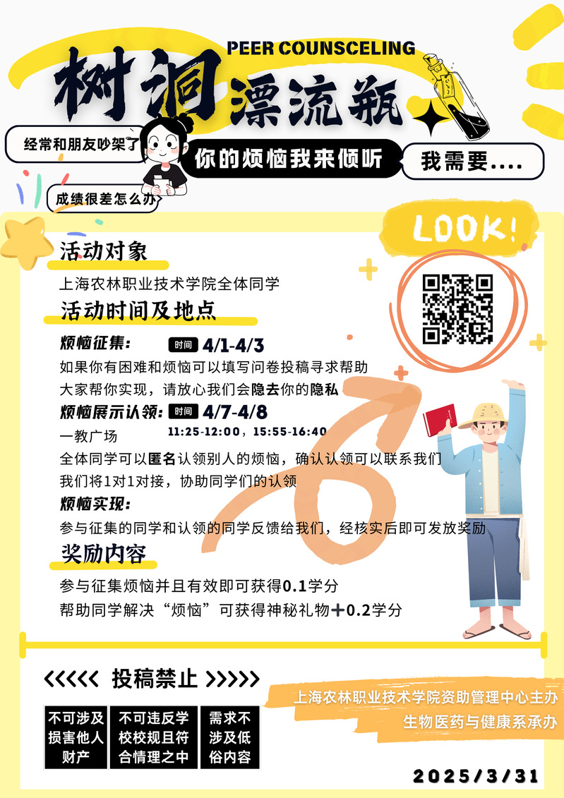 为深入落实资助育人工作,营造温暖互助的校园氛围,学院资助管理中心和生物医药与健康系精心策划并组织了“树洞漂流瓶”朋辈互助活动。活动自4月初启动以来,历经心愿征集、展示认领、实现反馈等多个环节,于4月底落幕。此次活动通过搭建朋辈互助平台,让全校学生共同参与,用实际行动传递温暖与关爱。