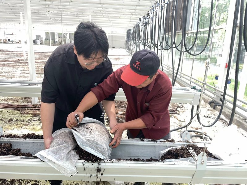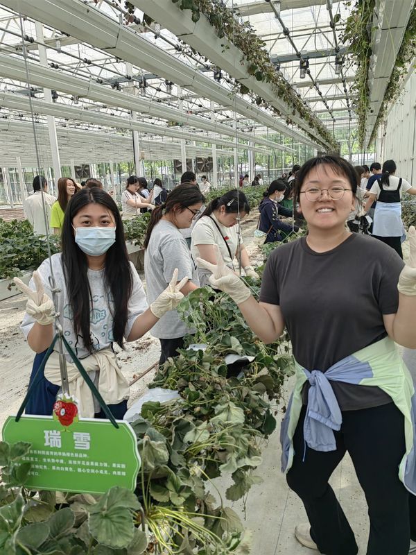 实训基地呈现出一派热火朝天的农事劳动景象。同学们在老师带领下,分组参与到各项农事活动中,重点任务是清理实验草莓和黄瓜挂绳搭架。