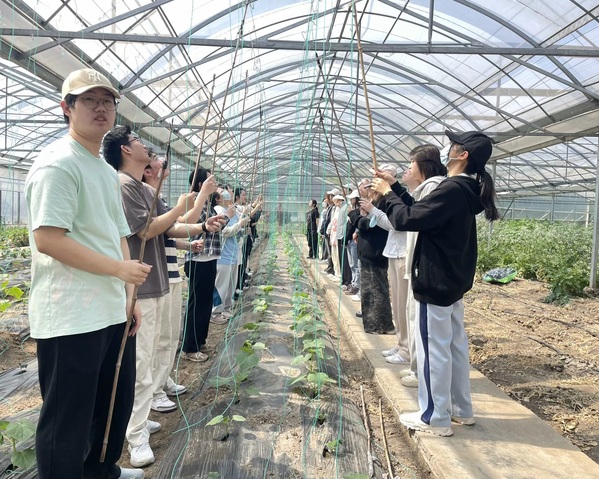 在草莓大棚内,同学们迅速分工协作。有的同学负责拔除已结束实验的草莓苗,他们双手握住苗茎,轻轻一拔,带着泥土芬芳的草莓苗便被完整拔出,有的同学则忙着拆除覆盖在草莓苗上的薄膜,动作细致又利落。在黄瓜挂绳搭架的劳动实践中,同学们顶着烈日,一丝不苟地完成每一道工序。有的同学踮起脚尖固定挂钩,手臂酸胀仍坚持作业;有的同学弯腰整理藤蔓。尽管棚内温度较高,汗水湿透了衣衫,但大家依旧干劲十足。同学们互相鼓励,高效配合,最终完成任务。“一开始觉得很简单,但实际操作才发现需要耐心和技巧,累却充实。”李鑫梅同学分享道。李芊祐同学表示:“团队合作让劳动变得轻松愉快,也让我更珍惜农民的辛勤付出。”