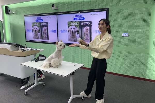 动科系黄小乘老师主讲《宠物心理与行为》公开课,进行40分钟的有生课堂教学、10分钟的现场说课。黄老师首先通过讲解犬在不同情绪状态下的肢体表现,帮助学生理解犬如何通过身体姿态、尾巴变化、耳朵位置、嘴部表现等细节传达情感和意图;随后结合实际案例,如犬在社交、训练和生活场景中的行为表现,让学生深刻理解犬的肢体语言如何反映其内心状态。为了使知识更加直观化,课堂还结合了多媒体资源和助教小狗的现场展示,通过真实情境让学生观察犬的肢体语言特征,并通过案例分析引导学生理解如何判断犬的情绪和行为目的,充分展现了扎实的专业功底和教学创新能力。