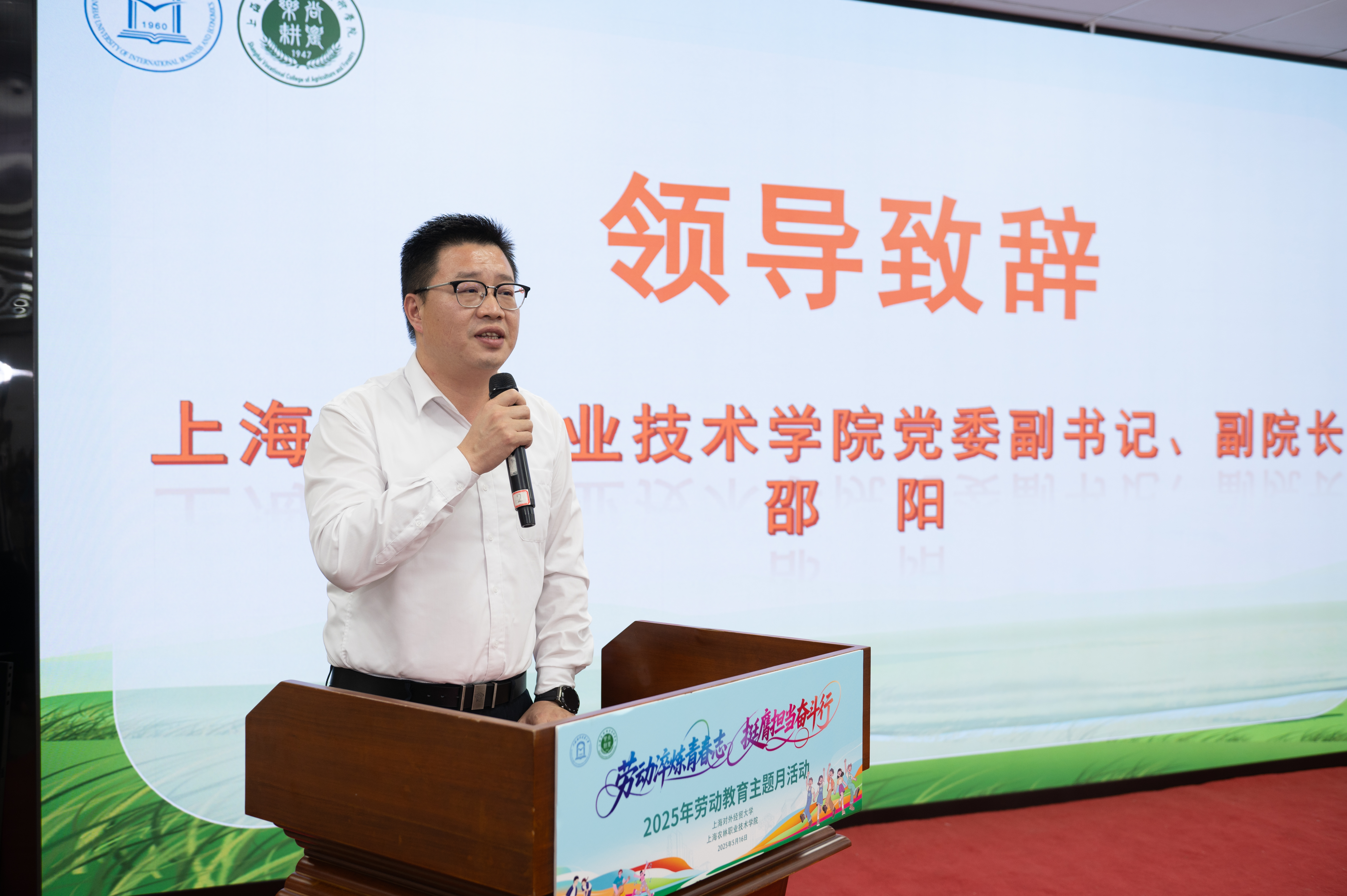 邵阳在启动仪式上致欢迎辞。他指出,学院作为上海市唯一农字头高校,依托农林专业优势,利用实训基地丰富资源,将劳动教育与农林学科的实践教学紧密结合,安排学生参与田间种植、作物养护、园林设计与维护等实践劳动。他强调,此次劳动教育主题月活动不仅是一次实践活动,更是构建大中小一体化育人体系的重要探索——小学阶段启蒙劳动认知,中学阶段深化实践体验,大学阶段强化创新创造,如同培育幼苗,从播种到灌溉,再到开花结果,形成完整的育人链条,让劳动教育理念贯穿学生成长全程,使学生在循序渐进中树立正确的劳动价值观,实现德智体美劳全面发展。