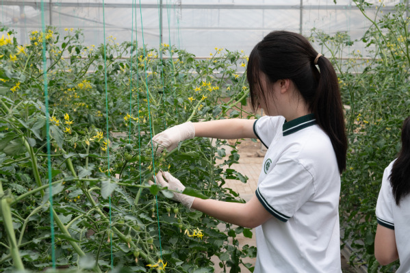 活动现场洋溢着热烈的劳动氛围。在专业教师的指导下,大中小学生分组协作,有条不紊地开展劳动。“种稻得稻”插秧实践活动中,指导老师现场示范插秧的基本技巧与要领,从如何握秧苗、控制间距到插入角度等细节进行讲解。同学们学习后亲手实践进行插秧,挽起裤腿、赤脚下田,投入到这场“接地气”的劳动实践中。大学生作为“劳动小导师”,发挥知识与体能优势,率先示范正确插秧姿势,中学生负责传递秧苗,小学生则在一旁协助整理,大家齐心协力,一排排嫩绿的秧苗整齐地扎根水田。番茄整枝打杈实践活动中,同学们走进番茄大棚,了解番茄的生长过程以及整枝打杈在果实发育中的重要作用。理论讲解结束后,同学们分组实践,他们仔细观察每一个果枝,通过合理整枝打杈,使其主枝突出、株型合理,在一次次判断与操作中锻炼动手能力与细致耐心。从水田到番茄园,不同学段的学生通过协作配合,将课堂所学转化为实践成果,在劳动中体会“粒粒皆辛苦”的深意。