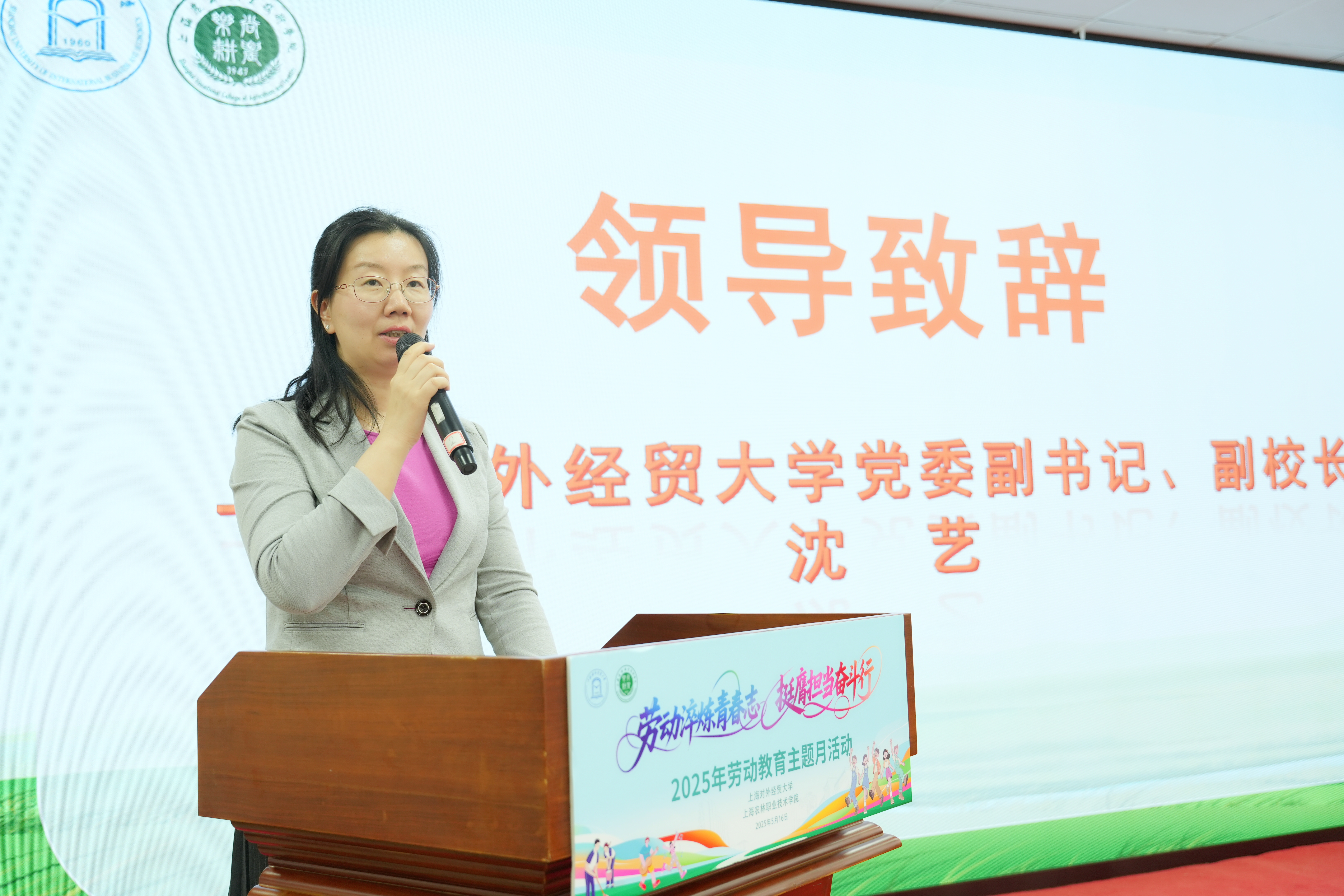 沈艺在启动仪式上致辞。她指出,本次活动是上海对外经贸大学2023年获批的教育部思想政治工作精品项目——“六三三”劳动教育体系的又一落地举措,对促进大中小学思想政治教育一体化具有积极意义。她强调,大中小学不同学段的学生都要在劳动中提升相应的能力,以劳树德、以劳增智、以劳强体、以劳育美、以劳创新,共同体验“劳动最光荣、劳动最崇高、劳动最伟大、劳动最美丽”的深刻内涵。