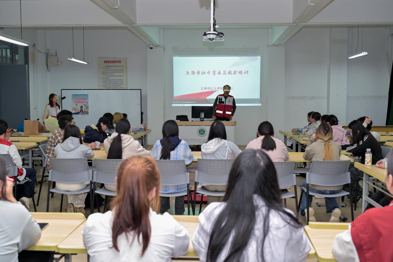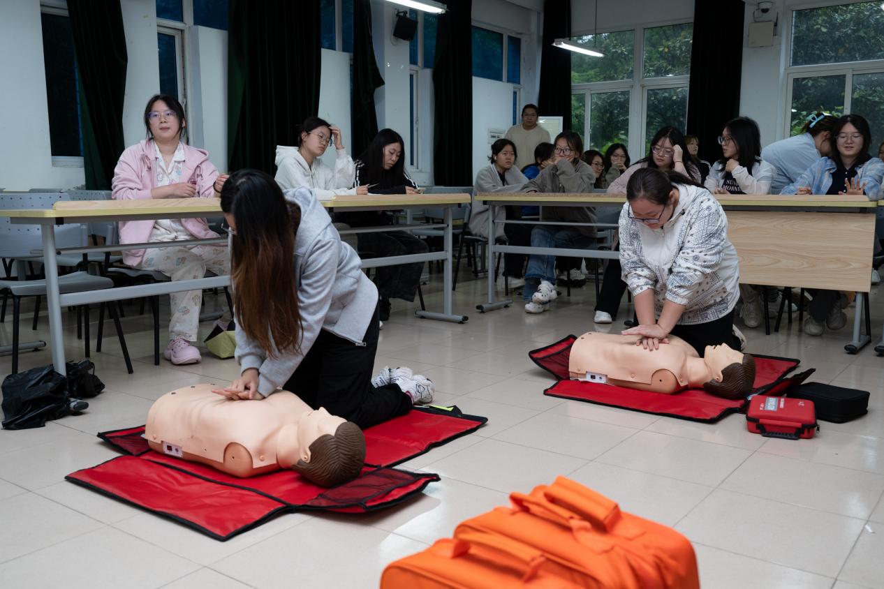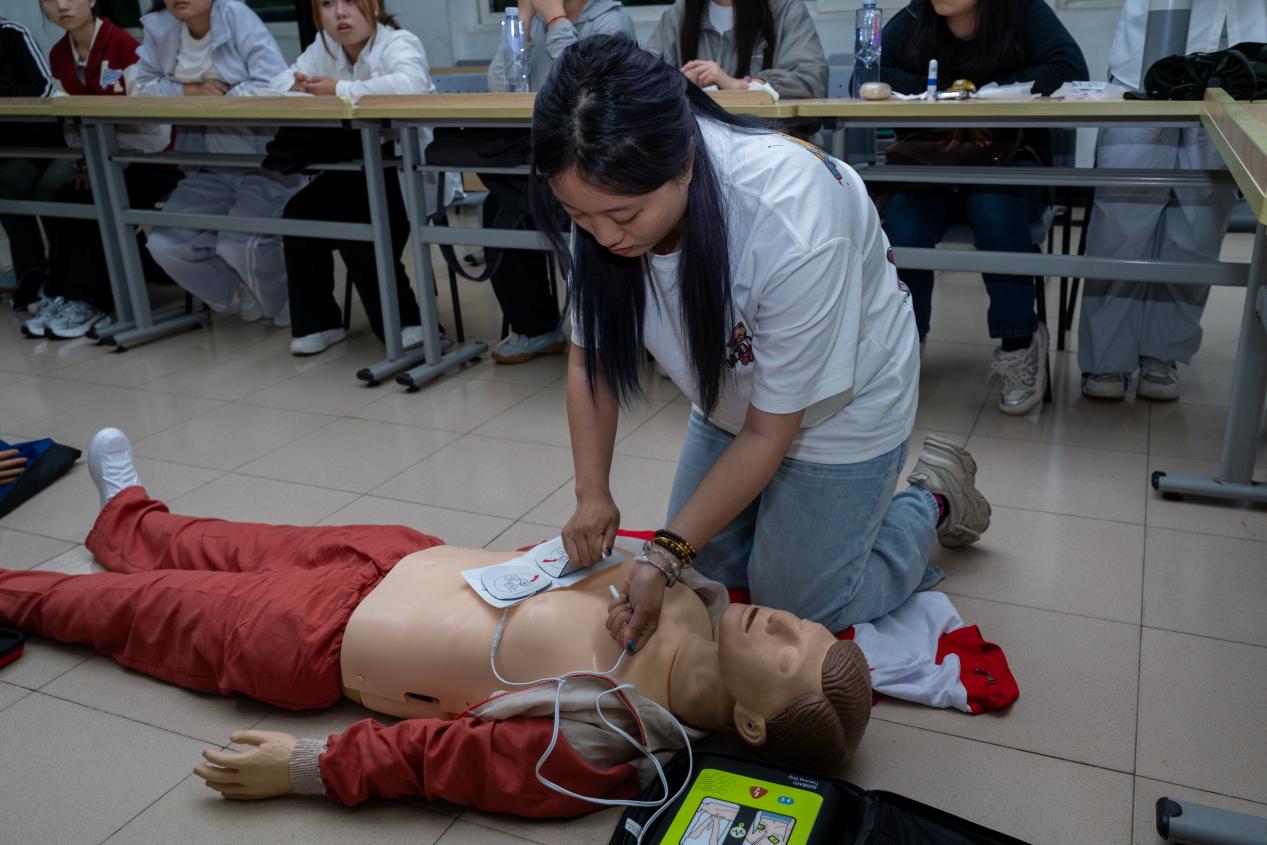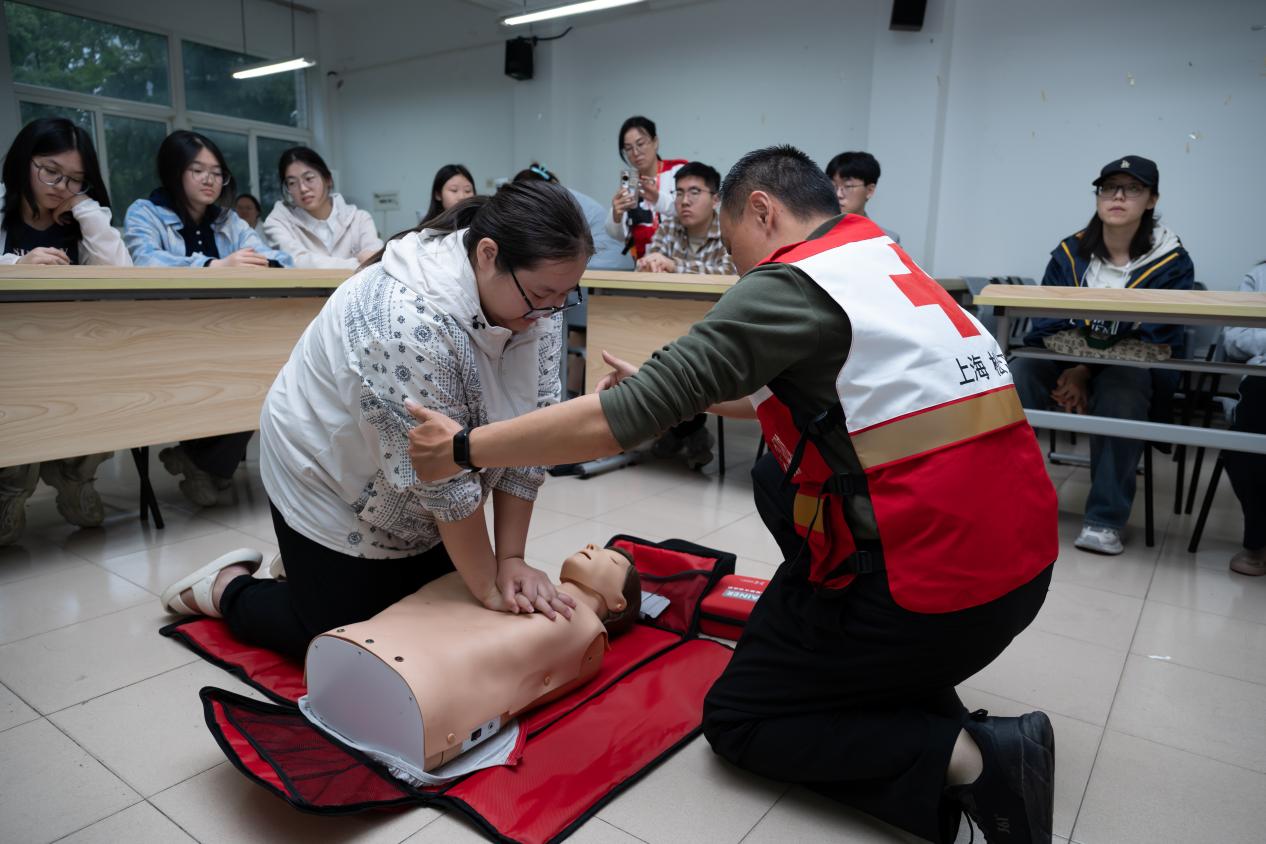 开展急救培训。培训由岳阳街道培训师资主讲,采用理论学习+技能实操与考核的培训模式。报名的40位同学通过“救在身边 守沪生命”红十字救护培训系统微信小程序端进行了线上理论学习与考核。培训内容丰富实用,师资们运用模拟人、自动体外除颤器(AED)训练机等专业教具,对心肺复苏和AED的操作步骤进行了细致入微的讲解与标准演示。从判断现场环境安全、快速识别患者意识与呼吸,到胸外按压的深度、频率把控,再到AED的正确使用流程,讲师们手把手教学,确保每一个动作规范到位。在场的同学们也一一进行实操练习和考核,通过反复练习,每一位同学都切实掌握了正确的急救技巧。