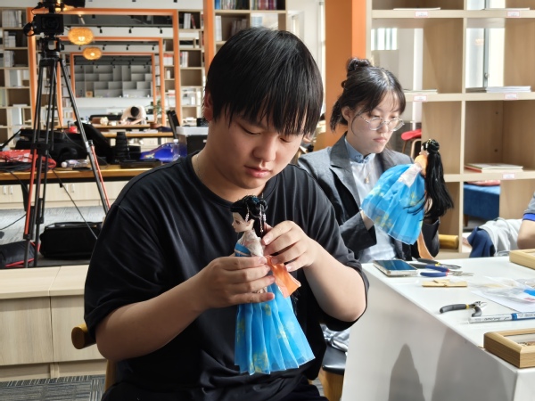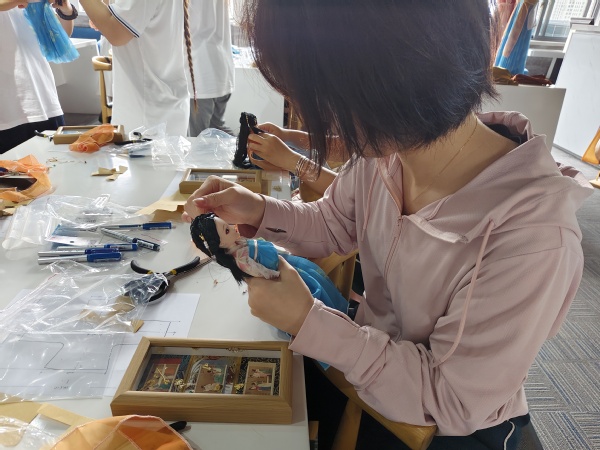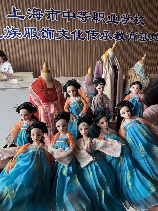 在实操环节,附设中职班的同学们全情投入。围绕《捣练图》,大家深入了解“捣练”劳作以及梳篦、花钿、帔帛等装饰品知识后,便迫不及待地拿起工具开始制作。制作曲裾时,同学们仔细裁剪布料、认真缝制;制作钗、簪、步摇、梳篦等发饰时,他们运用剪刀、钳子等工具,耐心细致地弯折、镶嵌,充分发挥创意。将发饰插到娃娃头上,再给娃娃穿上亲手制作的齐胸襦裙,每一个步骤都凝聚着同学们的心血。看着各具特色的成果,大家脸上洋溢着自豪的笑容。