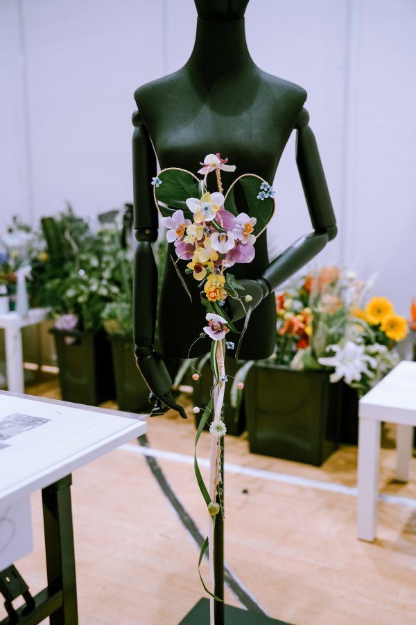 作为上海市职业教育品牌赛事,本届花艺赛项实现赛制突破性改革,将传统个人赛升级为每队3人的团队赛,比赛形式从单一技能操作拓展为技能测试环节+综合展示双环节考核体系。技能测试环节,比赛时限为180分钟,选手需团队协作完成5个模块任务,涵盖花束设计、传统插花等模块;综合展示环节,限时8分钟,要求各参赛队伍基于技能测试环节的内容及过程进行展示和阐述。