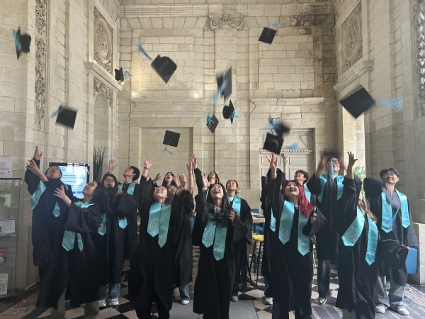在颁证环节,法国亚眠高等商学院校长为14名学员颁发了毕业证书,现场掌声不断。同学们纷纷合影留念,并举行了抛学士帽仪式,庆祝学业完成。