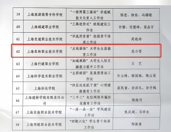 近日,由中共上海市教育卫生工作委员会、上海市教育委员会组织开展的2024年上海高校辅导员特色工作法征集展示工作评选结果正式揭晓,我院专职辅导员范小雪的《“点线面体”大学生生涯教育工作法》成功入选。