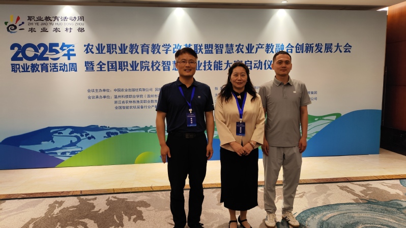 5月24日,2025年农业职业教育教学改革联盟智慧农业产教融合创新发展大会暨全国职业院校智慧农业技能大赛启动仪式在浙江温州举行。本次大会和活动是教育部等九部门牵头举办的2025年职业教育活动周系列活动之一,由农业农村部科学技术司指导,中国农业出版社有限公司、国家农业信息化工程技术研究中心联合主办,由温州科技职业学院携手浙江省农林牧渔类职业教育行业指导委员会、全国智能农机装备行业产教融合共同体承办。来自全国50余所涉农院校、科研机构和行业企业200余名代表参会。院长陈立婧率团参会。