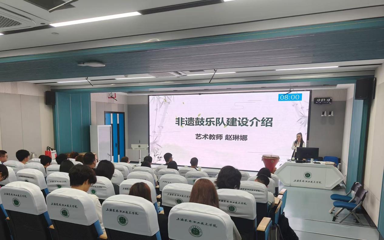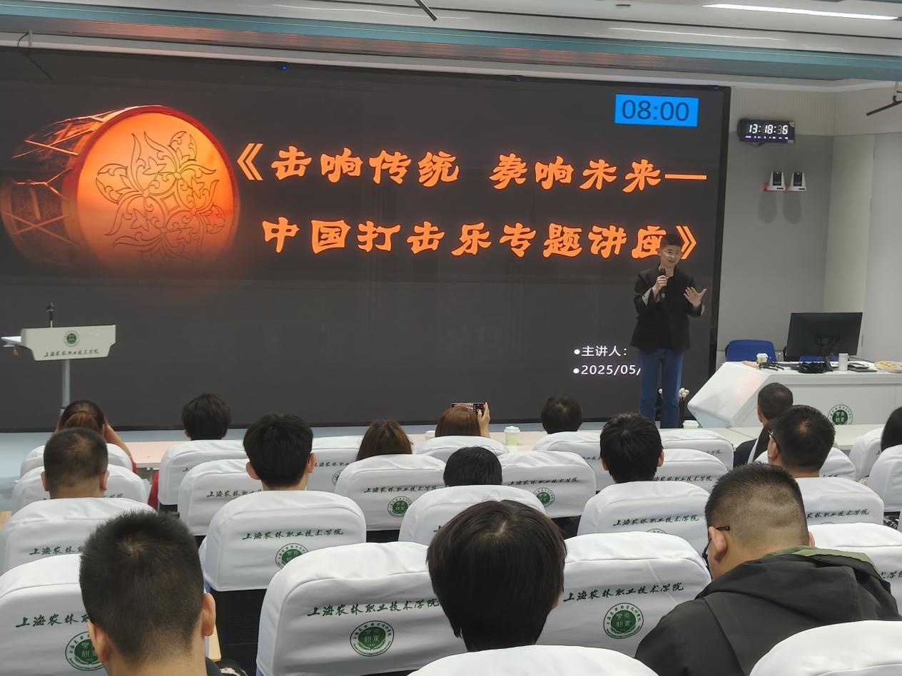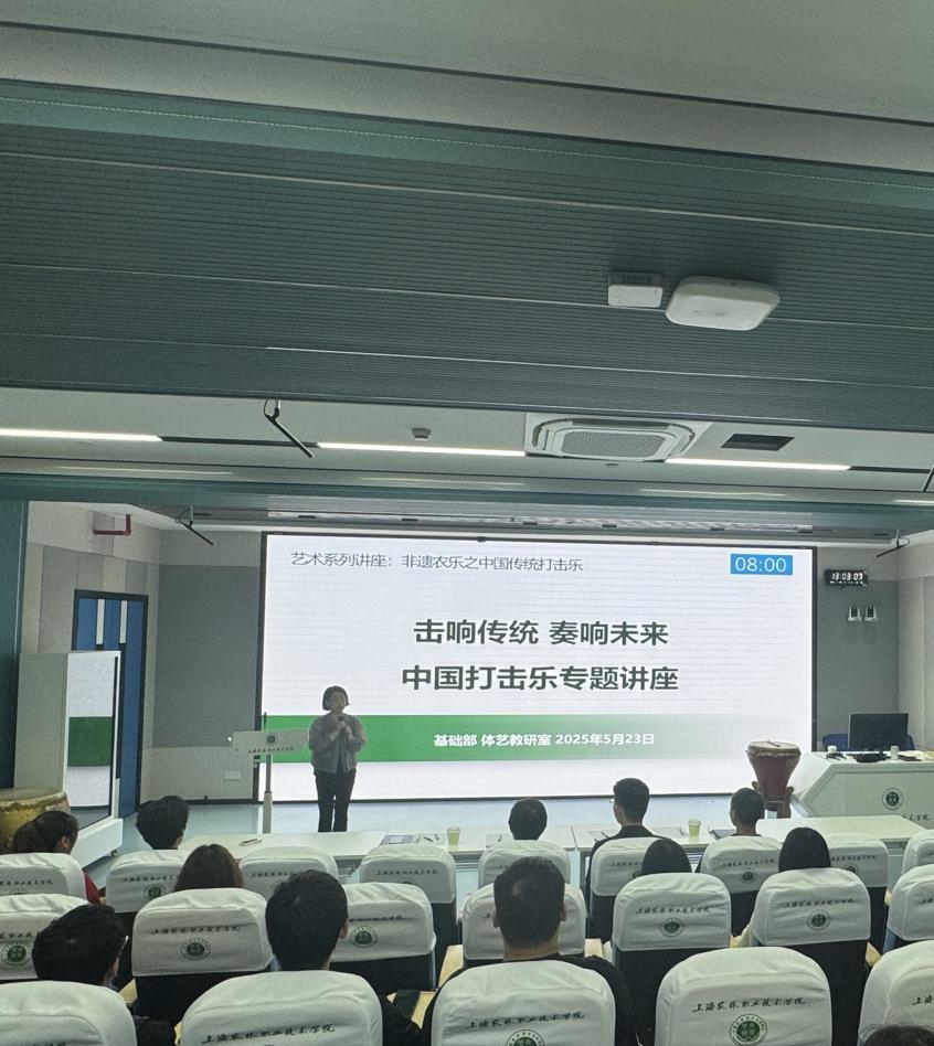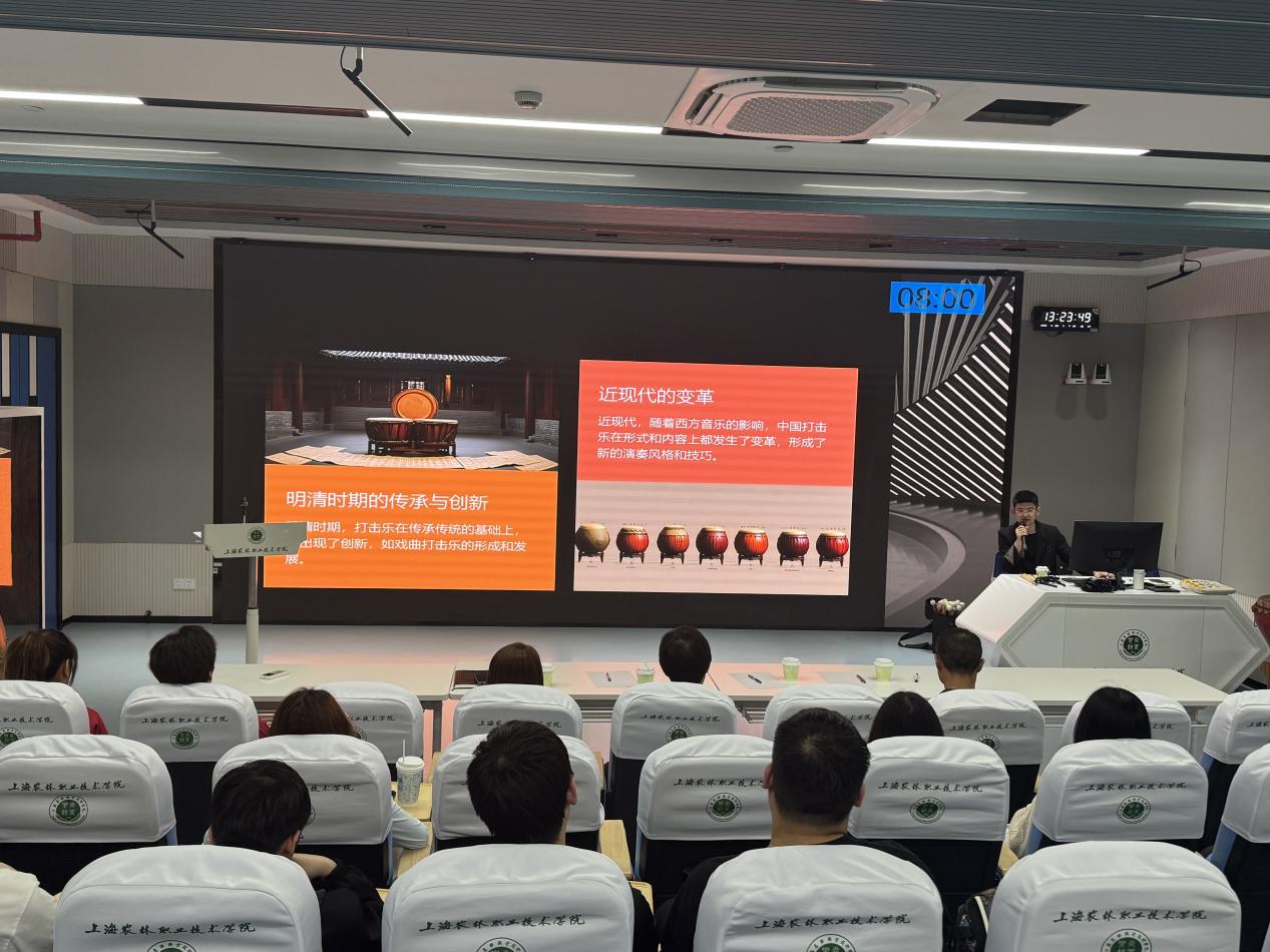 为大力弘扬中华优秀传统文化,推动非遗鼓乐的传承与创新,进一步提升学生对传统文化艺术的认知,5月23日,基础部举办了“击响传统 奏响未来”中国打击乐专题讲座。本次活动特邀青年演奏家张粼枫担任主讲。党办院办主任费明、基础部主任宋常英、支部书记孔黄生与学生代表共同参与了本次活动,活动由艺术课教师赵琳娜主持。