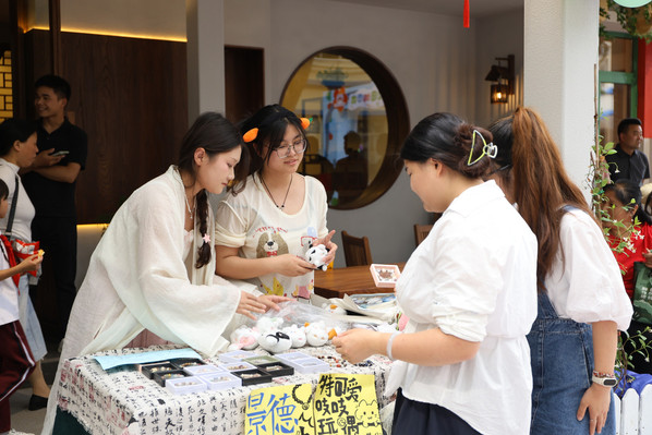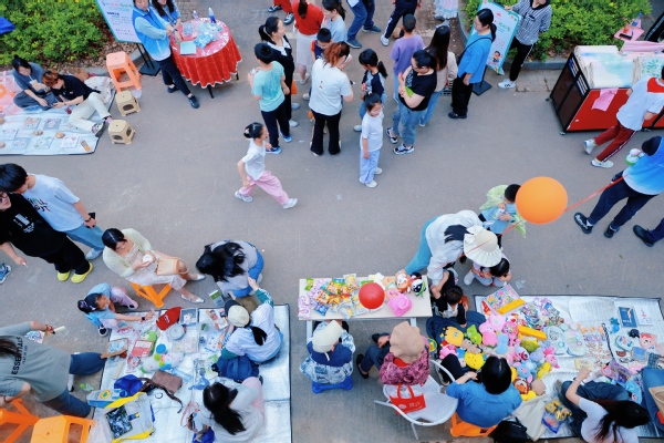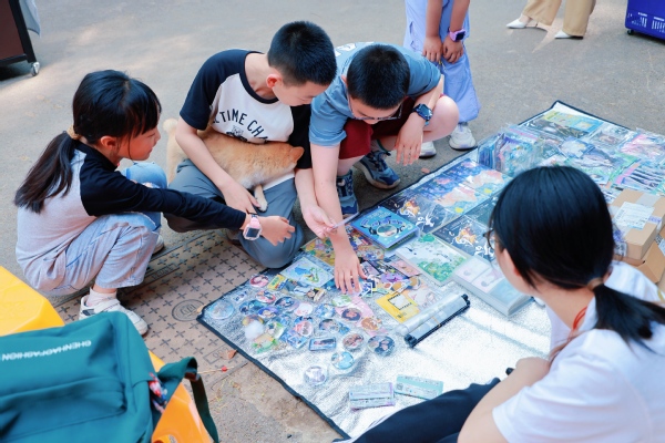 原创手作摊位前,以各种元素为灵感设计出的书签、头饰、发簪,还有调香及中药手串,深受欢迎,不仅展现了学子们的巧思,更无声地传递着非遗和环保理念;二手物品也很受欢迎,“循环经济”理念深入人心,抓娃娃软糯可爱,图书再次被浏览,旧物在这里焕发新生;景德镇非遗手串摊位与呆萌玩偶、解压捏捏乐等潮流摊位,更是传统文化与现代潮流文化碰撞的生动体现,引得现场很多小学生驻足。现场琳琅满目、热闹非凡,烟火气与文化味交织的巷弄,瞬间化身充满青春活力的 “校园实践场”。这场活动不仅是学生锻炼展示和销售能力的平台,更是他们锤炼技能、践行环保、传播法治文化的重要舞台。