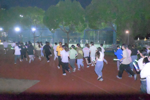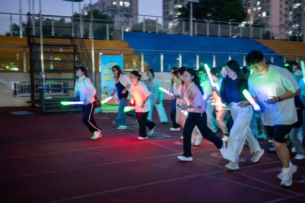 活动设置了3个项目环节,分别为荧光单人夜跑、单人赛和接力赛。在荧光单人夜跑中,来自不同年级和系部的近百名同学准时集合,脸上洋溢着兴奋与期待,充分热身,为跑步做好准备。随着起跑提示音的响起,同学们手持荧光棒如离弦之箭般冲出起跑线。夜幕下,荧光闪烁,大家互相加油打气,鼓励助威。