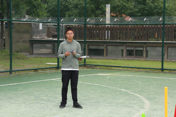 无人机飞行比赛中,操控者熟练地操作遥控器,让无人机在半空中完成各种复杂的飞行动作,展现出同学们对现代农业科技的熟练掌握。