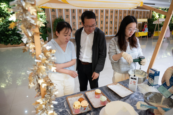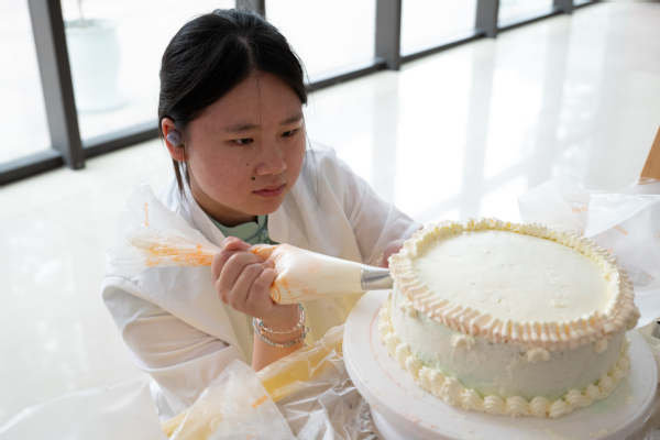 蛋糕裱花区,同学们化身“甜品艺术家”,手持裱花袋,在蛋糕胚上精心创作,一朵朵栩栩如生的奶油花朵、可爱的卡通造型在他们手中诞生。