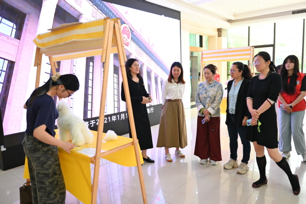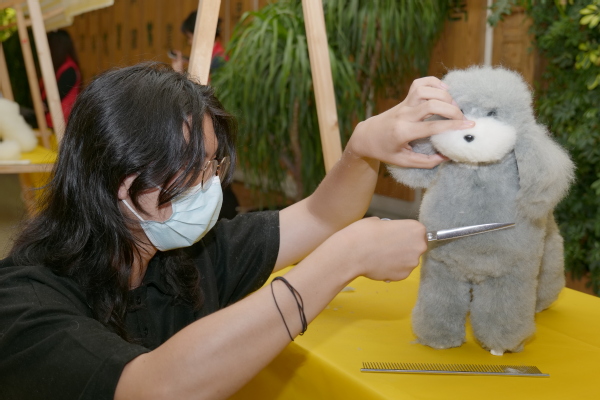 宠物美容项目里,选手们为宠物狗模型梳理毛发、修剪造型,尽显专业与耐心。