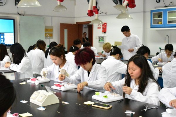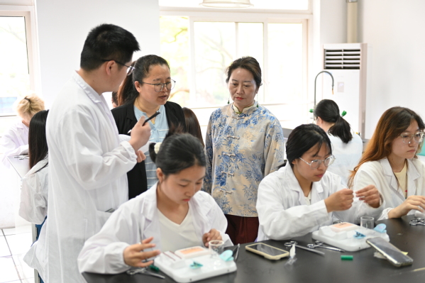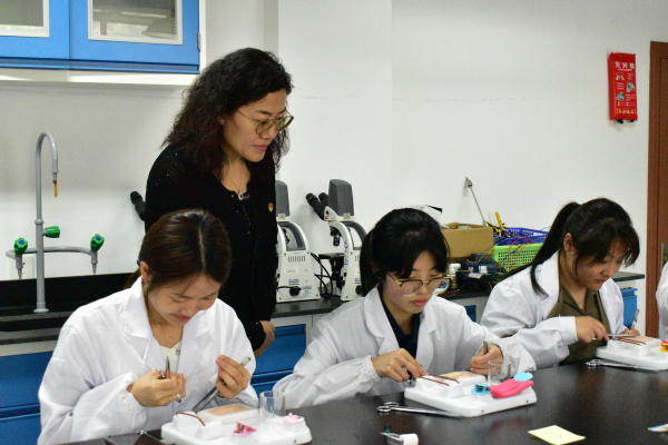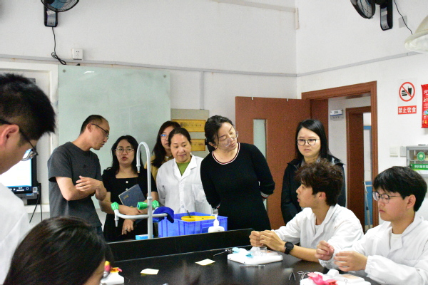 在动科楼208教室,手术缝合比赛紧张有序地展开。参赛选手们专注于精细操作,展示了扎实的临床基本功。本次比赛由李天顺老师担任评委,对选手的操作规范性、熟练度和最终效果进行了专业评判。