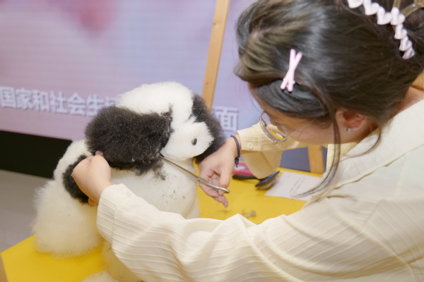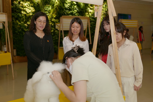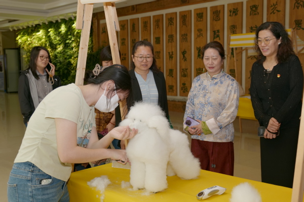 与此同时,在综合楼一楼,宠物美容竞赛现场同样精彩纷呈。选手们运用所学知识和技巧,为模特犬进行创意与实用兼具的美容造型。郑敏萍老师作为本项比赛的评委,对选手的技术水平、审美能力和操作流程进行了细致的考核。