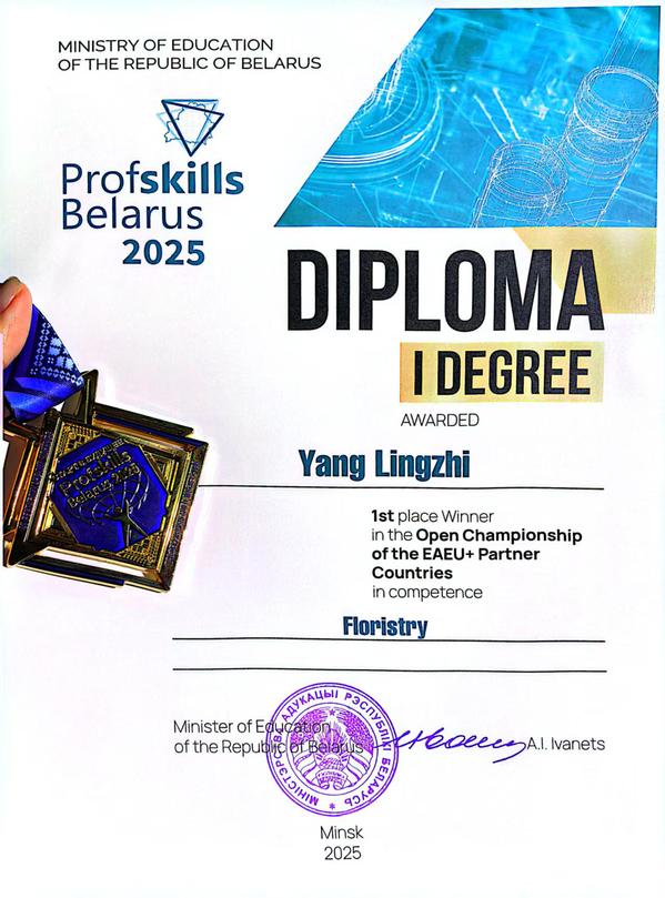 5月23日至26日,第六届白俄罗斯共和国职业技能大赛暨欧亚经济联盟及伙伴国职业技能公开赛在白俄罗斯共和国明斯克举行。受中华人民共和国人力资源和社会保障部选派,我院植物科学技术系教师杨灵芝代表中国参加花艺项目角逐,世界技能大赛花艺项目中国集训基地陆多佳作为教练。经过为期三天,涵盖六个模块的激烈比拼,杨灵芝凭借精湛的专业技能和出色发挥,勇夺该项目金牌,再次身披国旗,在国际赛场为国争光。
