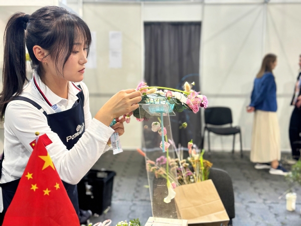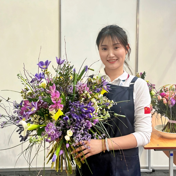 本次大赛汇聚了各国花艺技能选手,杨灵芝在比赛中沉着应战,展现出了当代中国技能人才的高超水平和卓越风采。花艺项目竞赛围绕商业花艺、婚礼花艺和新趋势三大任务。分别制作商业花束、商业礼盒插花、自然风螺旋花束、创意新娘手捧花、扇形螺旋手捧花和使用剑山式切花,共计六个模块,其中商业花束模块为惊喜盒。此次竞赛整体以商业花艺为主,同以往竞赛风格大不相同,对选手的知识储备、技能功底和临场应变能力提出了极高要求。