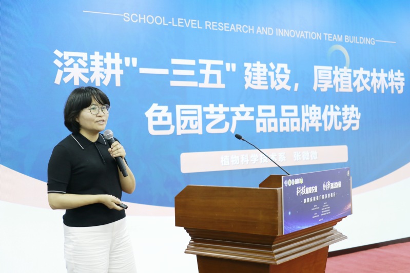 上农植慧种质资源科研创新团队负责人张微微展示“深耕‘五个一’建设,厚植农林特色园艺产品品牌优势” 的成果,彰显农业科技在特色领域的深度探索与创新。