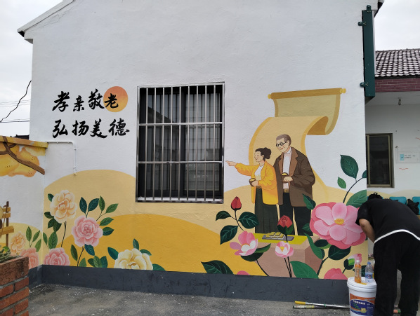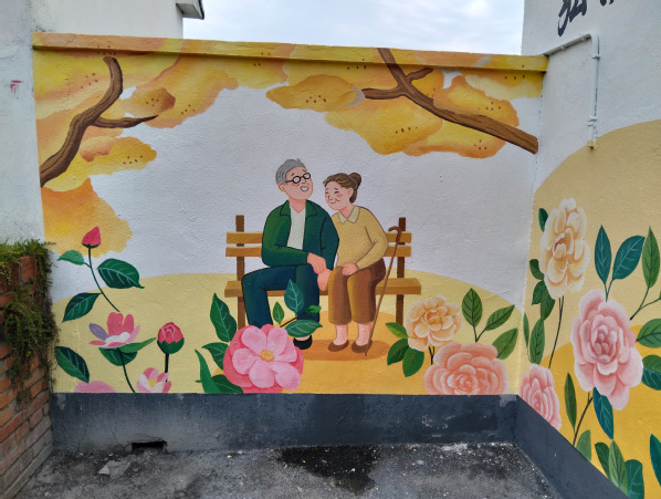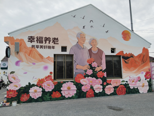 整体构图上,将墙面划分为三大区域。顶部以盛放的茶花为基底,粉色花瓣舒展蔓延,花蕊点缀金色光芒,象征着王港村蓬勃的生命力。中部左侧展现红色文化,描绘飘扬的红旗;右侧呈现温馨的养老画面,老人手拿山茶花,展现和谐的养老氛围。主墙体用茶花、老人形象,寓意红色精神代代相传,滋养着村庄的美好生活。色彩运用方面,红色突出红色文化的厚重感与革命精神;粉色和白色的茶花营造柔美温馨氛围;大地色系展现乡村质朴底蕴。表现手法上,采用写实与写意结合,使画面兼具真实感与艺术感染力,让村民与游客在墙绘前感受王港村的历史传承与人文关怀。