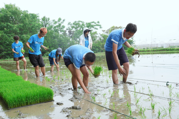 5月16日,一场跨学段协作劳动活动在学院实训基地精彩上演。由学院联合上海对外经贸大学、上海对外经贸大学附属松江实验学校教育集团共同开展的劳动教育月活动正式启动,80名大中小学生齐聚田间地头,共同书写劳动教育大中小一体化的生动篇章。活动中,大学生充分发挥知识与体能优势,担当“劳动小导师”,率先示范正确插秧姿势;中学生负责传递秧苗,保障物资供应;小学生则在旁协助整理,各司其职。一排排嫩绿的秧苗在大家齐心协力下,整齐地扎根水田。同学们还体验了番茄整枝打杈、植物拓印和漆扇制作等活动,在劳动中深切体会“粒粒皆辛苦”的内涵。此次活动促进了不同年龄段学生在劳动中相互学习、共同进步,实现了劳动技能、观念和精神的阶梯式培养,为劳动教育的创新发展提供了有益探索。