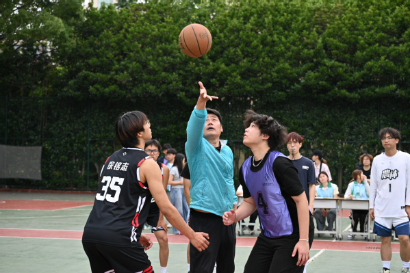 基础部体育教研室主任吴超老师分别为足球赛和篮球赛首场比赛开球,标志着比赛正式开始。