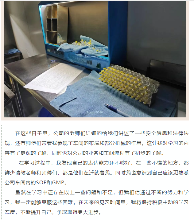 本学期,生物231、232班全体学生分批次赴临港奉贤、北上海开展为期两个月的跟岗学习。学生深度融入生产研发一线,在真实岗位中应用专业理论,完成从“学习者”到“准职业人”的角色体验。践习期间,严格执行“周报制度”,要求学生每周提交详实周报,记录技术要点、反思学习瓶颈、提炼职业感悟。累计收到周报111份,字里行间展现了技术认知深化、职业素养提升的显著变化。企业导师反馈普遍积极,认为学生“动手能力强,学习态度端正”。