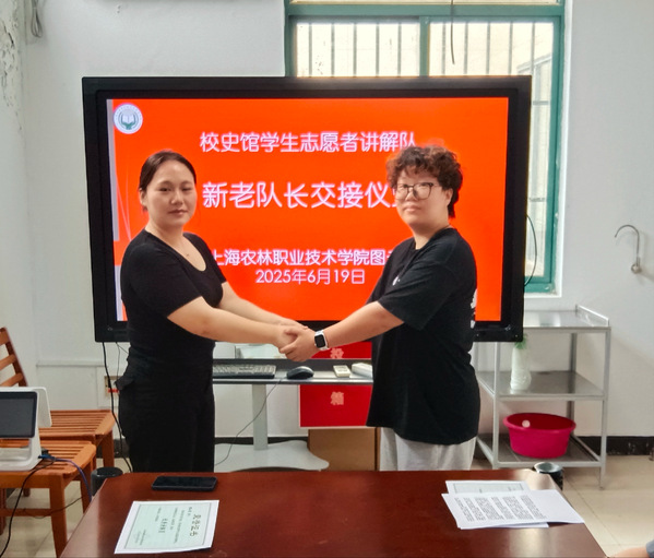 薪火相传。在新老负责人交接仪式环节,卸任的负责人张伶俐同学说:“校史馆负责人不仅仅是一个称号,更是负责讲好校史的重要岗位。所有讲解员都要感谢老师们搭建了校史馆讲解平台,让我们有了更多锻炼自己沟通能力和表达能力的机会。”新任校史馆负责人侯玉芳同学和张伶俐同学双手紧握的一刻,不仅仅是新老交接,更是责任的传递,是梦想的延续。侯玉芳同学表示,接过校史讲解接力棒,必将在老师带领下,不断总结经验,改正不足,引领校史馆学生志愿者讲解队讲好校史,让上海农业职业教育发展历程广为人知。