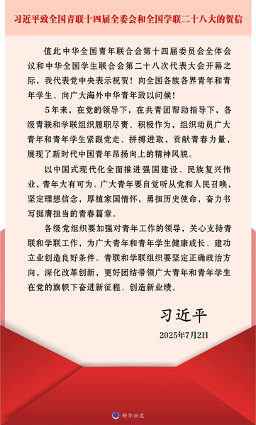 7月2日至3日,中华全国青年联合会第十四届委员会全体会议、中华全国学生联合会第二十八次代表大会在北京召开。中共中央总书记、国家主席、中央军委主席习近平发来贺信,代表党中央表示祝贺,向全国各族各界青年和青年学生、向广大海外中华青年致以问候。