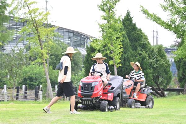 “智农未来·现代农机体验”项目,在老师带领下,同学们近距离观察植保无人机、履带式喷雾机、自走式草坪车等代表性农业装备,了解其在农业生产中的应用原理与操作方式。现场还特别安排了植保无人机精准作业演示,学生们目不转睛,纷纷惊叹于无人机的智能飞行与高效喷洒技术。在教师的指导下,大家亲自驾驶座驾式草坪车,在田间地头感受操控机器的快乐。