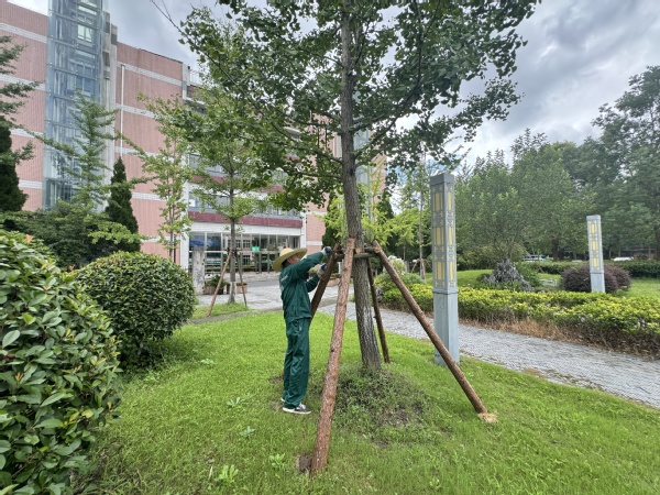 保绿团队重点做好校园绿化植物的防风加固工作,对高大乔木进行修剪,去除枯枝、病枝和过密枝条,减少台风来袭时树木倒伏的风险。对根系不稳固的树木,采用支撑加固的方式进行保护,防止树木被狂风刮倒。同时,保绿人员还对校园内的花卉盆栽、景观小品进行收纳或加固,坚决杜绝因物体坠落引发的安全事故,全力保护校园绿化景观的同时,消除安全隐患。