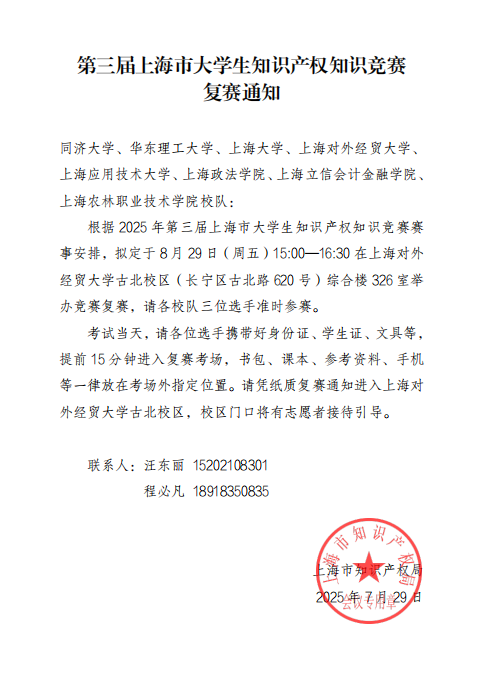 在2025年第三届上海市大学生知识产权知识竞赛初赛中,我校凭借扎实的专业知识和出色的临场发挥,以总分第一名的优异成绩晋级复赛。
